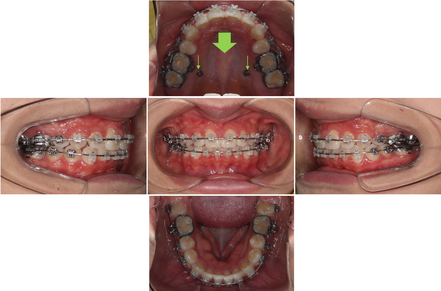 本症例は上顎前歯の後方移動量が最大限必要であったため口蓋側壁に植立した歯科矯正用アンカースクリューを使用して、上顎前歯の後方移動(上顎左右第一小臼歯抜歯)を行いました。